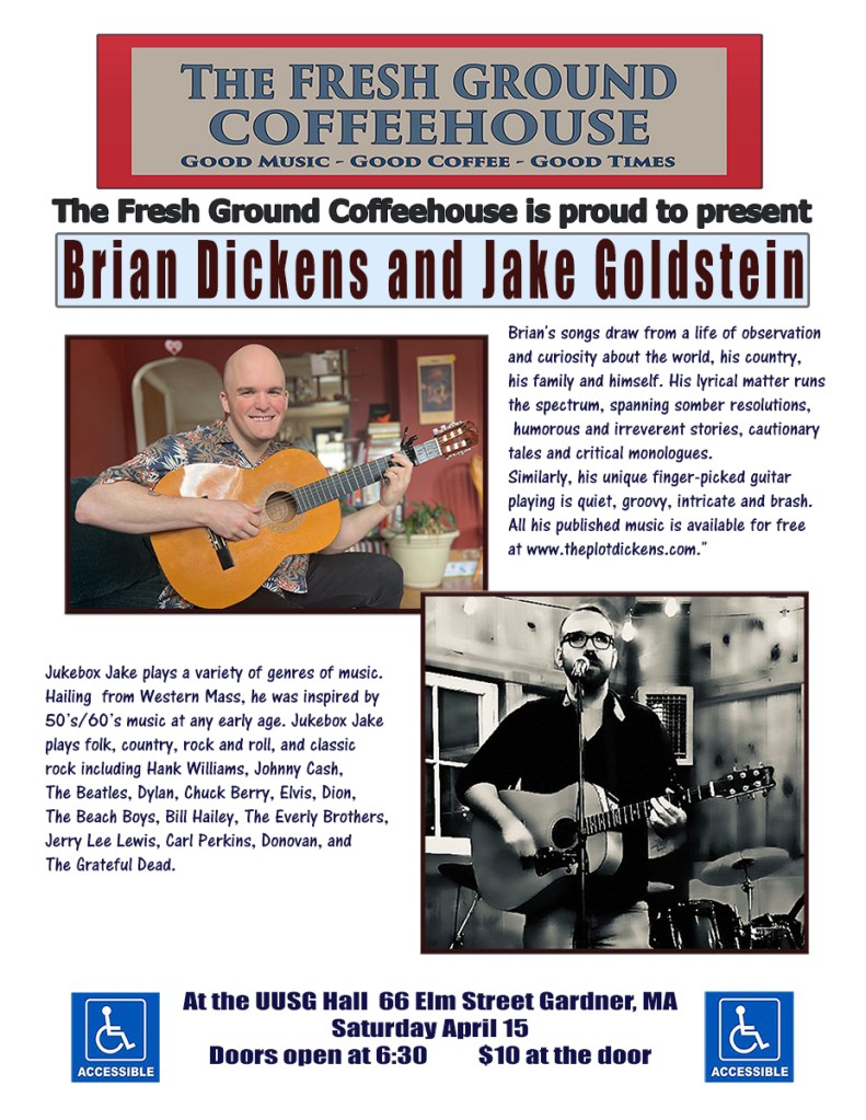 Onstage live at the Coffeehouse this month are Brian Dickens & Jake Goldstein. Doors open at 6:30 and admission is $10.
