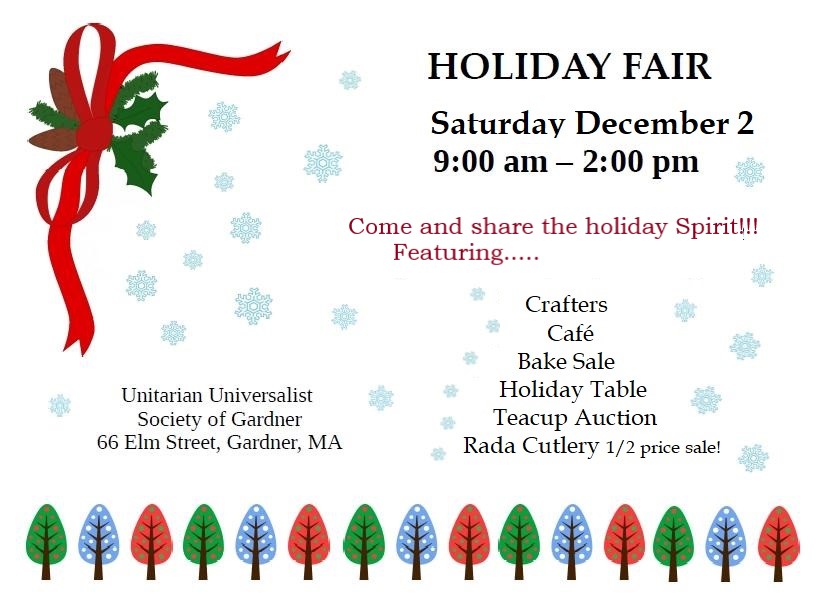 This is a busy month at UUSG. Please enjoy a look at all that is happening and discover what is of interest to you. There are flyers for the coffeehouse and the Holiday Fair attached which you may want to share with friends and family and everyone else you know. Please help to get the word out about these two special events.